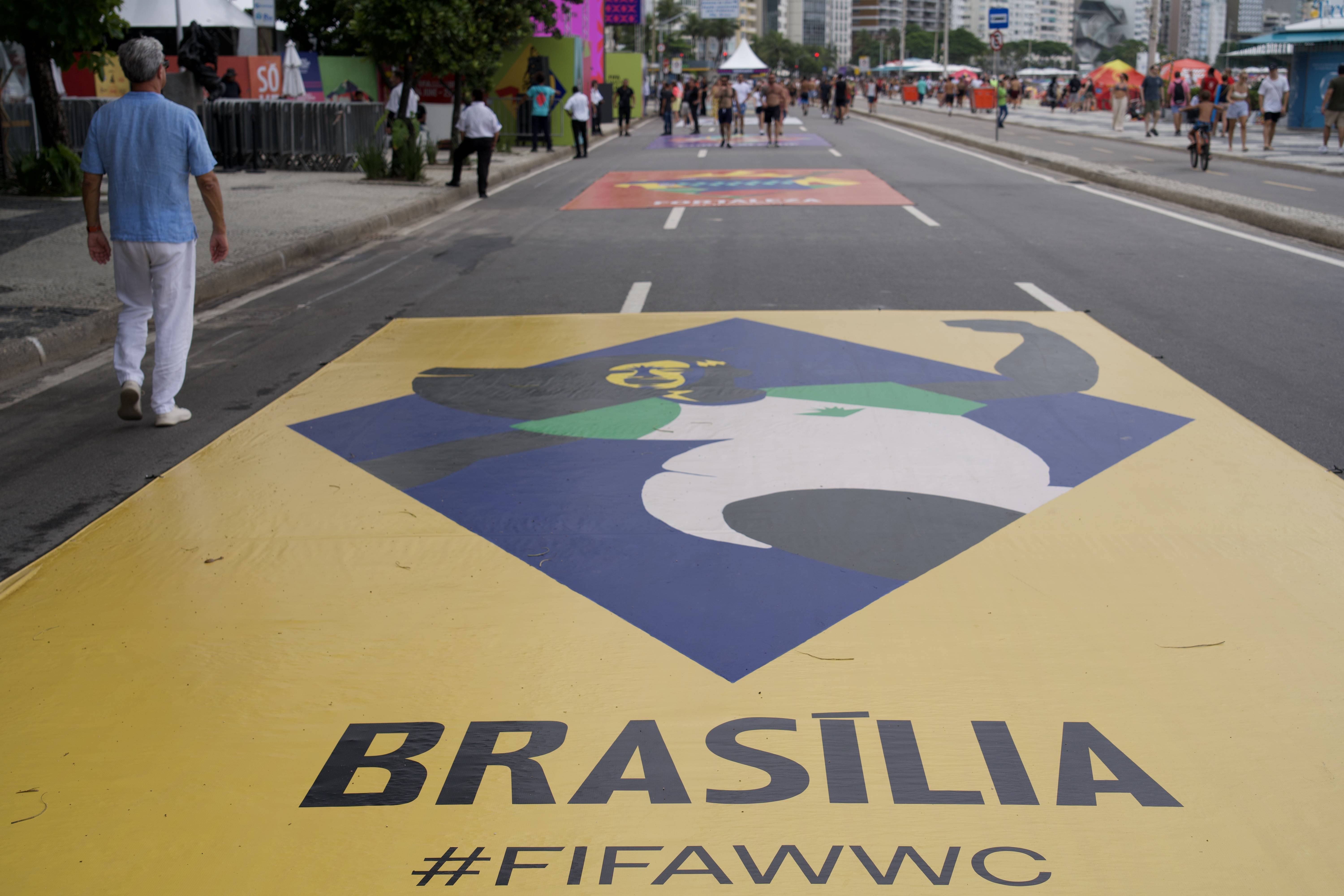 这是1月25日拍摄的在巴西里约热内卢大西洋大道上由来自八个主办城市的插画家与球迷们一起绘制的大型主题画。 新华社记者 周永穗 摄