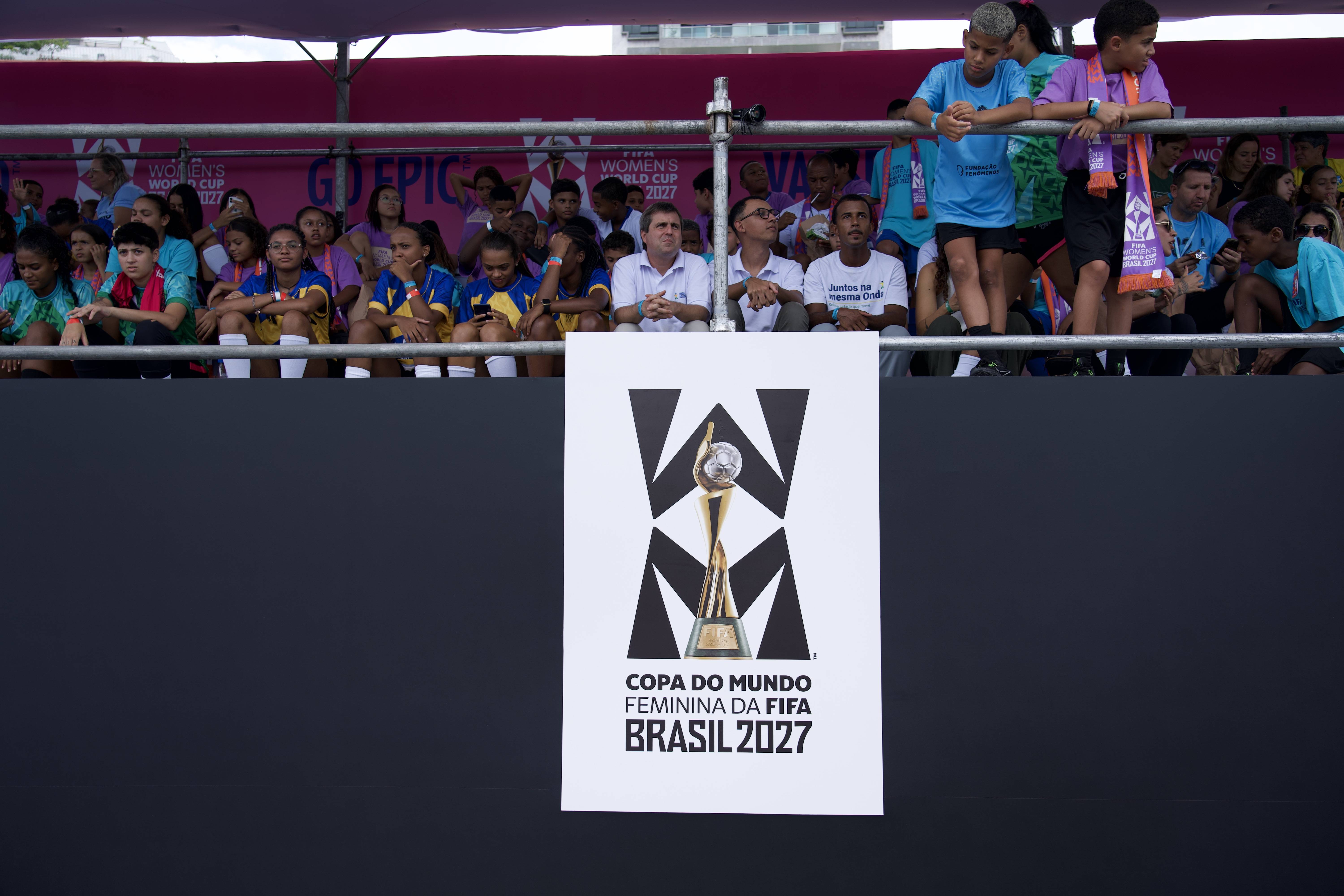 这是1月25日在巴西里约热内卢拍摄的2027年女足世界杯会徽和口号发布现场。 新华社记者 周永穗 摄