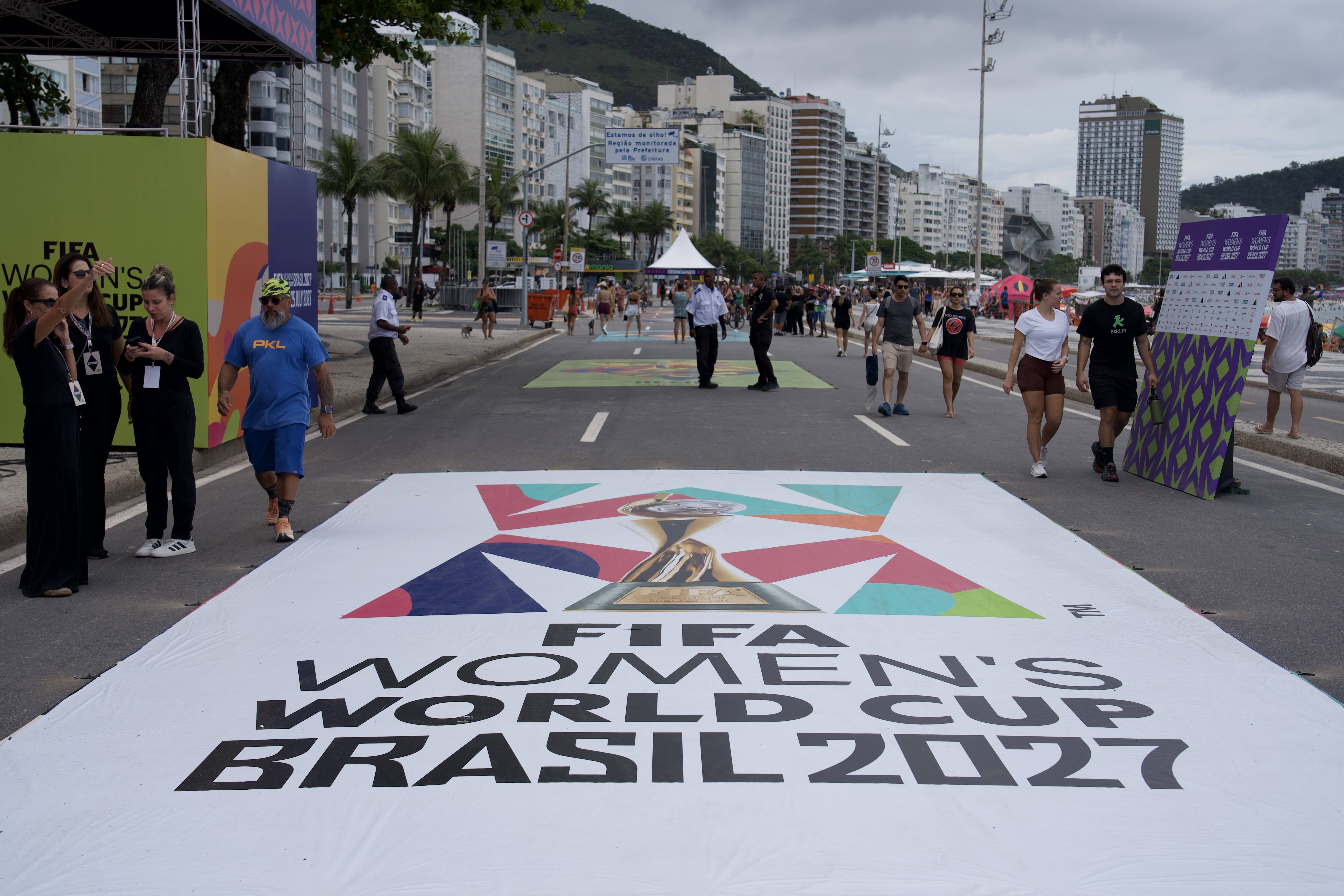 1月25日,在巴西里约热内卢海滩上举办的女足全明星友谊赛上展示的2027年女足世界杯会徽。 新华社记者 周永穗 摄返回搜狐,查看更多